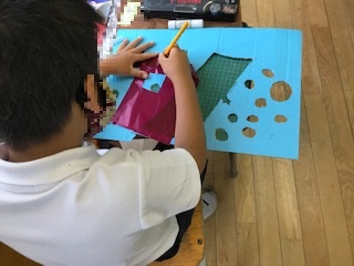 2年生は、図工の時間に、カッターナイフを使ってボール紙を切り取り、カラーセロハンを貼り付けて、ステンドグラスのような作品を作っています。