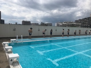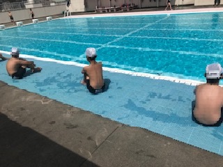 プールサイドでの体操、シャワー、並んで座っているとき、ディスタンスの徹底です。子どもたちもしっかり理解し、守られていました。