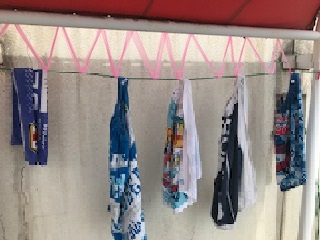 水泳時、バスタオルを持ってあがります。例年ならかごに入れていますが、今年度は個人の物として、間違えたりすることのないように、タオルも間を空けてかけるようにしました。ここでもディスタンスです。
