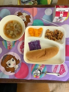 今日の給食は「コッペパン・牛乳・パエリア・ウインナーとキャベツのスープ・みかん(缶)・ブルーベリージャム」でした。