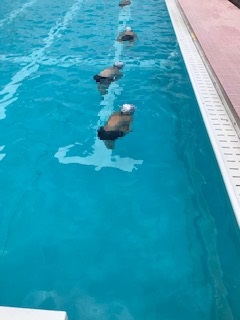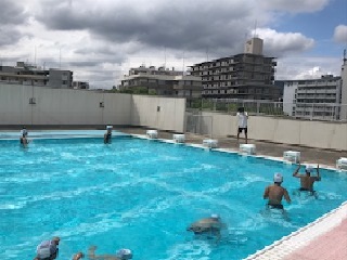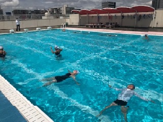 水慣れでは、だるま浮きや大の字浮き、倒立などで水に慣れてから、「エビカニクス」を踊る子どもたち。水の中では負荷もあり、とてもよい運動になります。