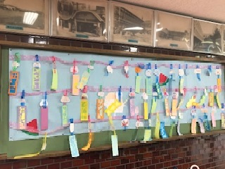 4年生が担当となり、かわいらしい切り絵の風鈴が飾られています。