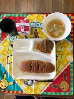 今日の給食は「こくとうパン・牛乳・煮こみハンバーグ・コーンスープ」でした。