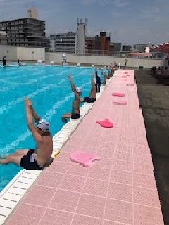 平泳ぎは腕のかき、足のけりの後、伸びているときに一番進みます。一つ一つの動きをしっかり確認しました。