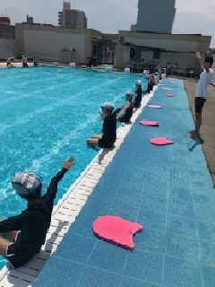 プールサイドに座って、足の動きや腕の動きを確認します。