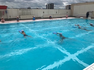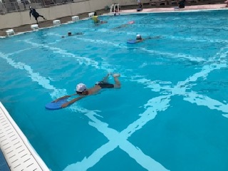 平泳ぎの練習。ビート板を持って、足のけりを覚えます。
