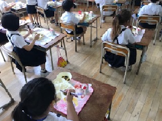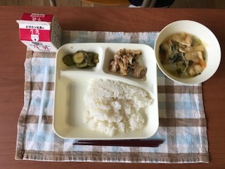 昨日の給食は「ごはん・牛乳・豚肉のごまだれ焼き・五目汁・きゅうりのおかかあえ」でした。