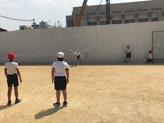 4年生の体育。ベースボール型ゲームに向けて、手でボールを打つ練習、ボールを捕る練習をしました。