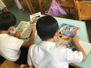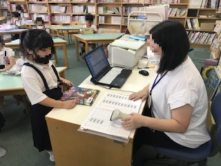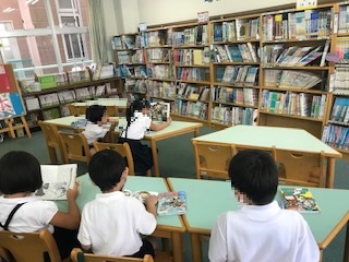図書の時間。夏休みに読む本を借りました。そして、静かに読書している1年生でした。夏休みもしっかり本を読んでほしいですね!!