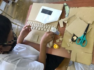 5年生の図工では、だんボールを切ったり、曲げたりして、形を作り、また、だんボールの特徴をとらえて創作の工夫をするなど、意欲的に創作活動に励んでいます。