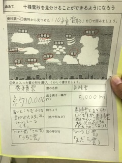 5年生の理科では、雲について学習中。雲にはいろいろな種類があること、それぞれの形状によって、雨を降らしたり、呼び名がたくさんあったりと不思議がいっぱい。