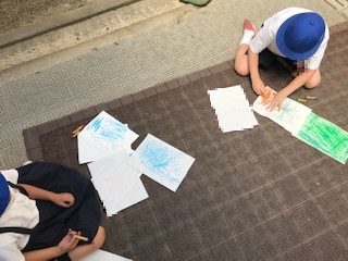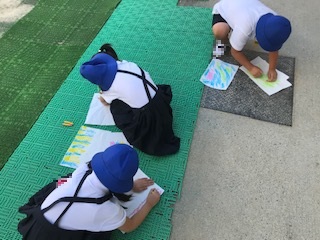 1年生が上質紙とクレパスを持って、中庭や渡り廊下などで何やら活動をしています。