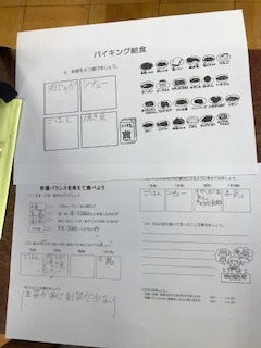 最初に、給食がバイキング形式だと想定して、各々にメニューを選びました。その後、「主食・主菜・副菜・その他」について学び、自分が選んだメニューを分けてみると、多くの子どもたちのメニューが偏りのあるものとなりました。