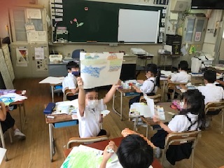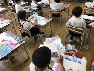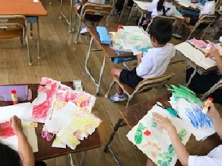 先日1年生が上質紙に写しとったマットなどの模様を思い思いに切り取り、組み合わせ、一つの作品を作り上げています。