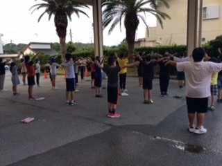 眠い目をこすりながら、ホテル前の広場で目覚めの体操をしたり、予定の確認をしたりしました。
