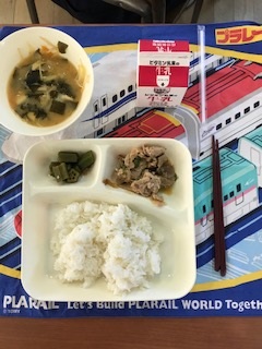 昨日の給食は「ごはん・牛乳・豚肉の甘辛焼き・みそ汁・オクラのおかかいため」でした。