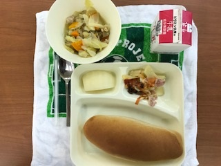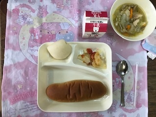 昨日の給食は「こくとうパン・牛乳・鶏肉とてぼ豆のスープ煮・じゃがいもとトマトのチーズ焼き・なし(二十世紀)」でした。