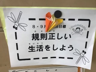 9月の生活目標は「規則正しい生活をしよう」です。8月・9月で継続しての設定です。夏休みが明けて、リズムを整えて学校生活を送っていけるよう、学校でも指導しています。