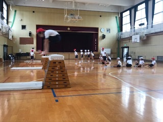 体育の時間。5年生がチャレンジしているのは、跳び箱の中でも難易度が高い「かかえこみとび」です。