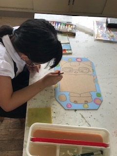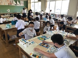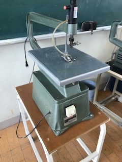 制作途中で、電動糸のこぎりを使います。子どもたちにとっては難易度が高い道具の一つです。説明を聞き、きちんとルールを守って取り組んでいます。無事に切り取る作業を終えて、彩色に移っています。完成間近の子もいました!