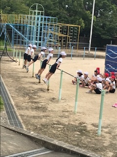 2年生が鉄棒に挑戦。つばめや布団干しなどの基本を振り返っていました。逆さ感覚や平衡感覚、複合的な動きが必要となる鉄棒です。苦手にしている子もいますが、まずはチャレンジするところからですので、声をかけながら、ポイントを押さえて指導していきたいと思います。