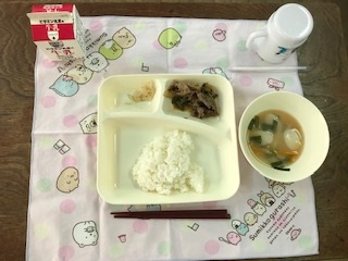 今日28日の給食は「ごはん・牛乳・プルコギ・トック・もやしの甘酢あえ」でした。