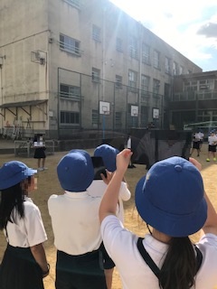 今日の6時限目、3年生が運動場で空を見ていました。よく見ると、黒い下じきのようなものを通して何かを見ています。聞いてみると、「太陽を見ている」とのこと。