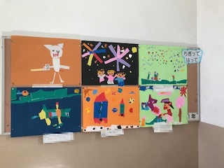 ・図工の作品です。紙をちぎって、貼り合わせたり、重ねてみたりして、絵を作り上げています。発想力豊かな作品ばかりですね!
