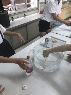 まずは、炭酸水から気体を集めます。保護者のみなさん、水上置換法って、覚えていますか?炭酸水が3分の2ほど入ったペットボトルを振り振りして、水の中にある試験管に二酸化炭素を集めていきます。