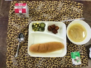 今日の給食は「コッペパン・牛乳・まぐろのオーロラ煮・ベーコンとじゃがいものスープ・きゅうりとコーンのゆずドレッシング・ソフトマーガリン」でした。