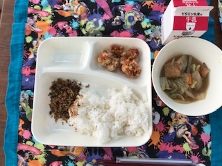昨日12日の給食は「ごはん・鶏肉のたつたあげ・あつあげと野菜の煮もの・おかかなっ葉」でした。