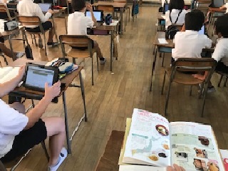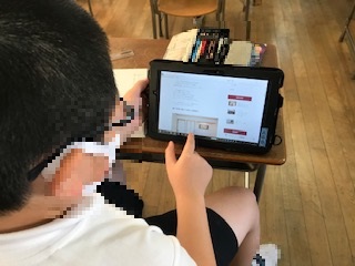 国語で「くらしの中の和と洋」を学んでいる4年生。タブレットや学校図書館の本を使って、調べ学習をしています。和と洋、たとえば、「たたみとフローリング」「湯のみとコップ」といったように、違いやよさなどを比較します。そのために、それぞれについて調べています。