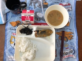 15日の給食は「ごはん・牛乳・さんまのみぞれかけ・みそ汁・牛ひじきそぼろ」でした。