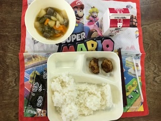 19日月曜日の給食は「ごはん・牛乳・みそカツ・じゃがいもと野菜の煮もの・焼きのり」でした。