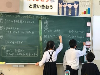 32×4なら、120より大きい答えになることは分かります。そこで、32を30と2に分けてみると、「30×4・2×4」という簡単な計算になることを発見できました。