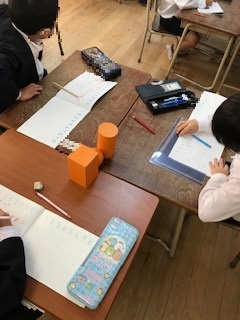 今日は、かたちの仲間分けについての学習です。どのかたちが仲間になるのか、かたちをよく見ながら考えます。