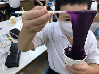 青や紫、黄、緑、色彩豊かなカップの中身は「スライム」です。懐かしいと思われる保護者の皆様もおられるのではないでしょうか?