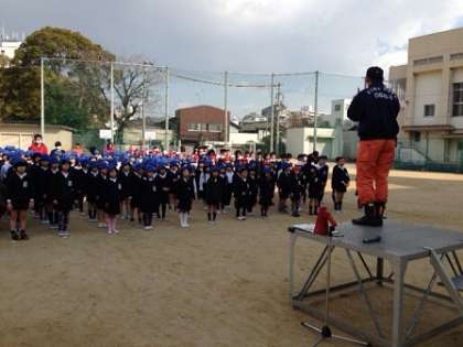 中本幼稚園と合同の避難訓練を実施しました。3時限目に地震が起こったという想定で行いました。教室で授業を受けている児童たちは、教室の机の下などに隠れ、その後、放送の指示で、運動場に避難しました。