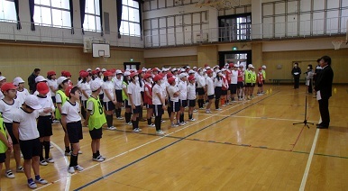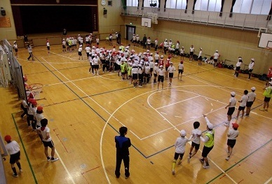本庄中学校区の3小学校(中本小、東中本小、今里小)の6年生が中本小学校に集い、自己紹介ジャンケンゲームやサバイバル・ドッジボールなどゲームやスポーツを通して、交流しました。(※晴れの場合、運動場でチーム対抗ドッジボールや長縄跳びをする予定でした。)