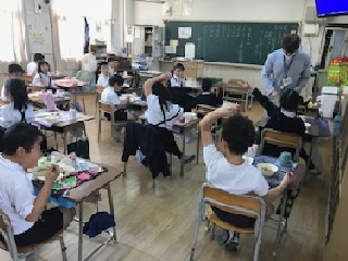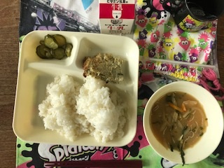 10月29日の給食は「ごはん・牛乳・お好み焼き・豚汁・きゅうりの梅風味」でした。