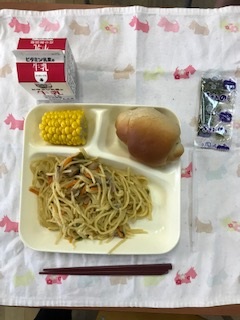 2日月曜日の給食は「こくとうパン(小)・牛乳・ウインナーときのこのしょうゆ風味スパゲッティ・焼きとうもろこし」でした。