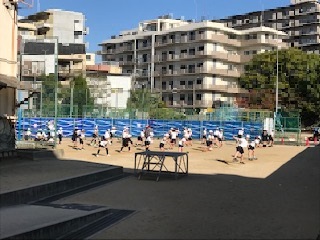 運動場で練習です。4年生は腰を低く落とすことがポイントです。がんばっています!!