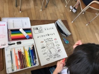 給食委員会では、給食目標ポスターの色塗りなどに取り組み、健康委員会では翌日の児童集会でのクイズに向けて活動していました。