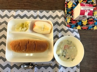 5日の給食は「おさつパン・牛乳・きのこのクリームシチュー・キャベツのピクルス・りんご」でした。