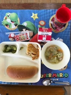 12日の給食は「こくとうパン・牛乳・ツナポテトオムレツ・スープ・きゅうりのバジル風味サラダ」でした。