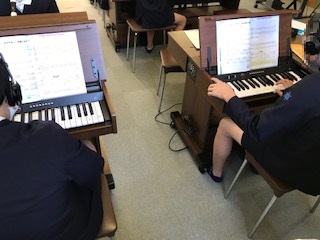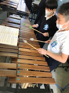 6年生は音楽の学習で合奏にチャレンジします。オルガンやリコーダー、木琴、鉄琴、と役割分担し、旋律の動きや音の重なりを互いに聴き合って演奏します。