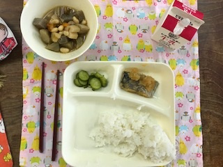 昨日の給食は「ごはん・牛乳・さごしのおろしじょうゆかけ・大豆と冬野菜の煮もの・きゅうりのしょうがづけ」でした。