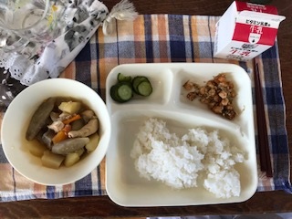 12月7日の給食は「ごはん・牛乳・鶏肉と野菜の煮もの・じゃこ豆・あっさりきゅうり」でした。