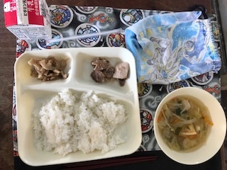 12月10日の給食は「ごはん・牛乳・豚肉のねぎじょうゆ焼き・すまし汁・れんこんのおかかいため」でした。