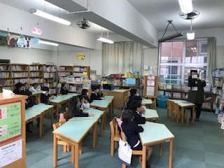1年生の図書の時間。本の貸出・返却や読みたい本を読んで楽しむ他に、木曜日は図書館補助員の方が勤務されているので、読み聞かせもしてもらっています。